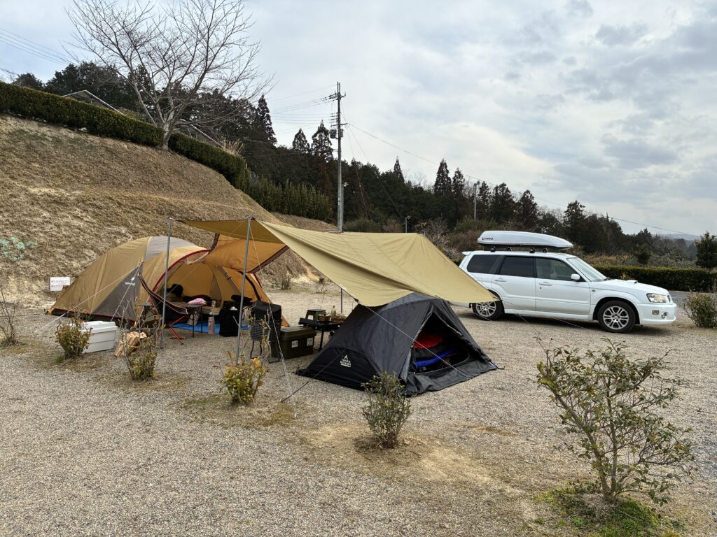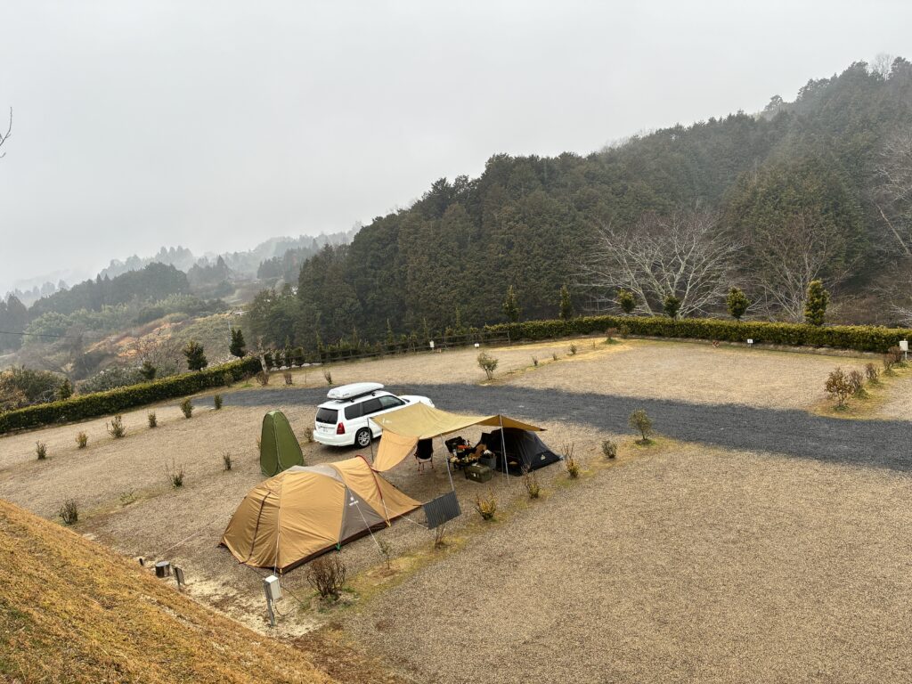 今回訪れた 月ヶ瀬炭焼きアウルキャンプ場 は、全サイト車横付け可・電源付きで冬キャンプでも快適。