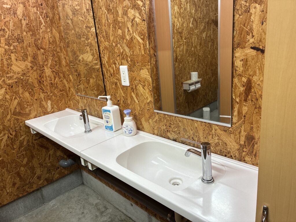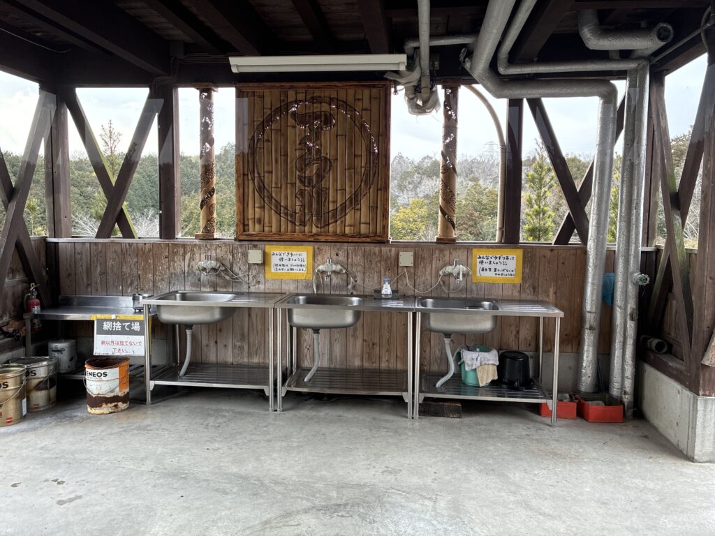 お湯も出るのでしっかり洗えます、ゴミ捨て場は遠いので生ゴミなど小さな袋を持って行く事をおすすめします。スポンジや洗剤は設置していないので自身で用意が必要です。炭はこの左に映っている缶?に捨てれます。