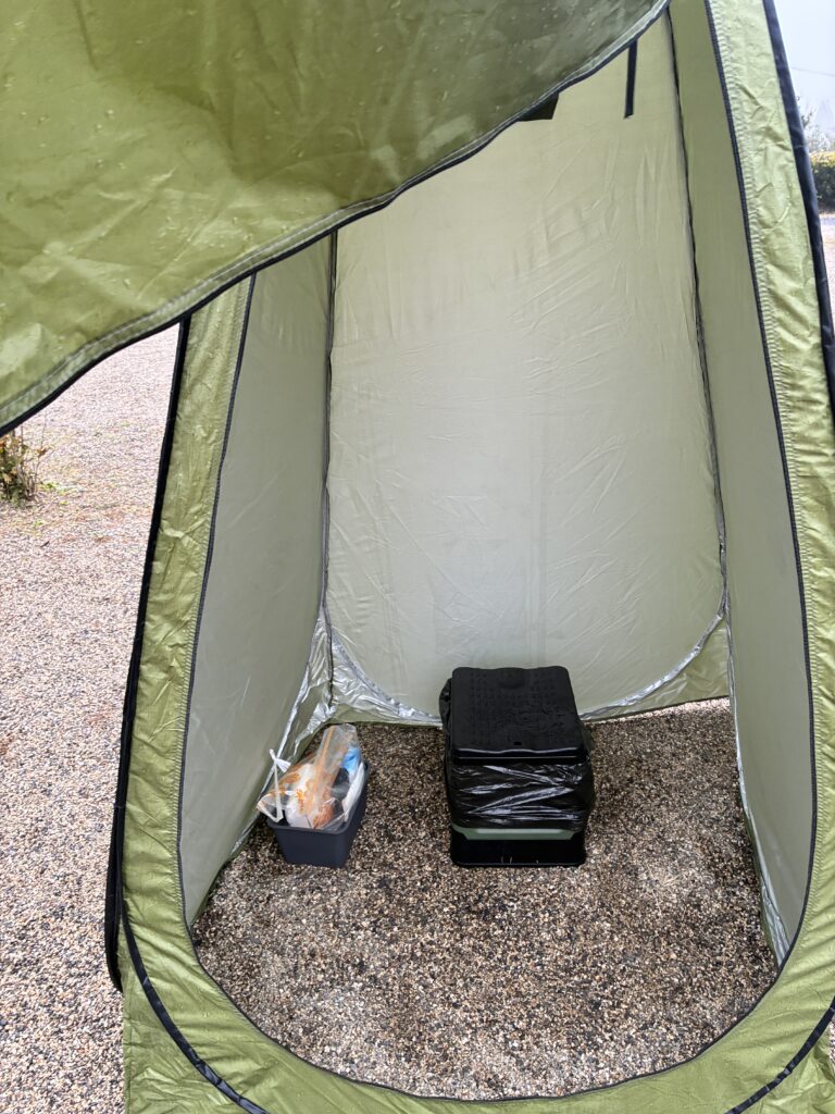 簡易トイレ、災害用に用意していたものだけどお試しで、夜間はこちらを使用、テントはポップアップテントでペグダウンしてます。