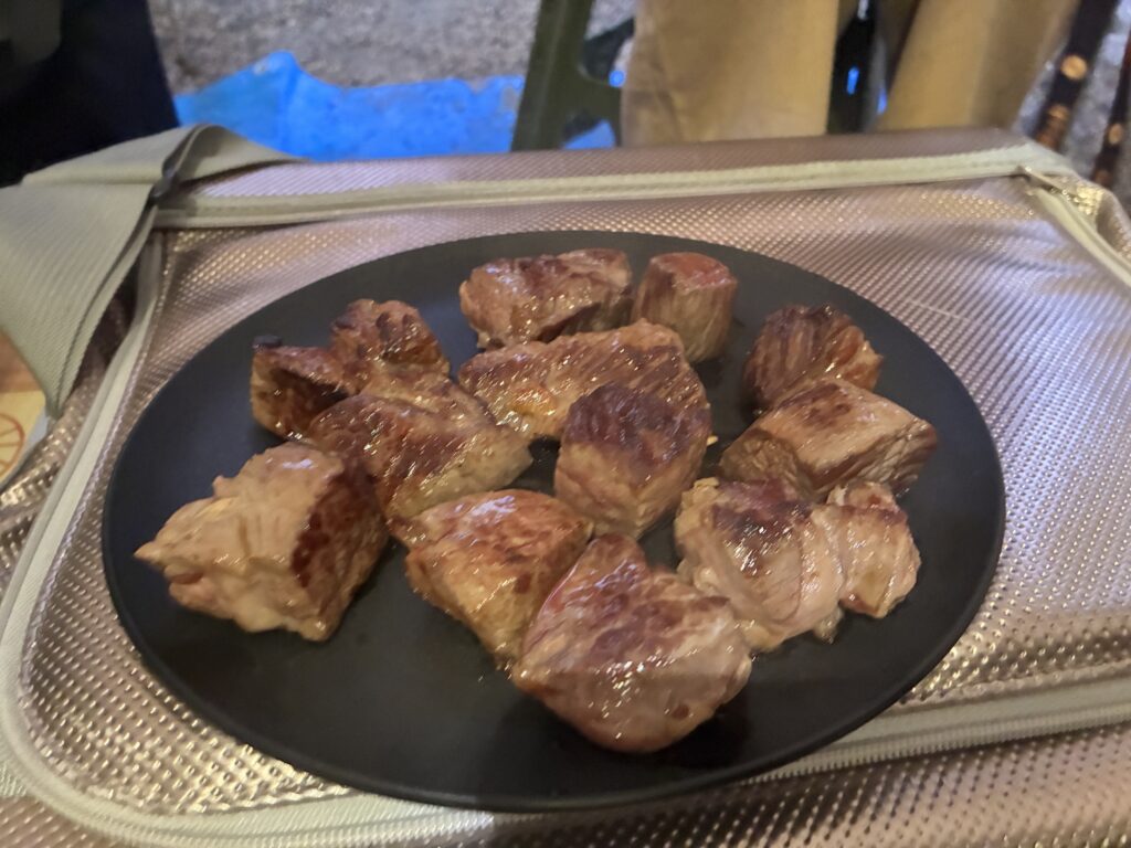 夜は早めに温泉に行ってゆっくりしてから、サイトに戻って、夕食。